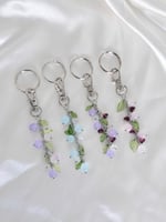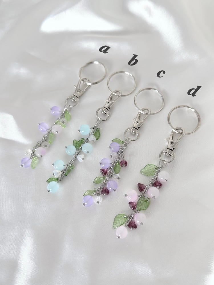Keychains made with zinc alloy clasps and stainless steel metal, and plastic and glass beads.