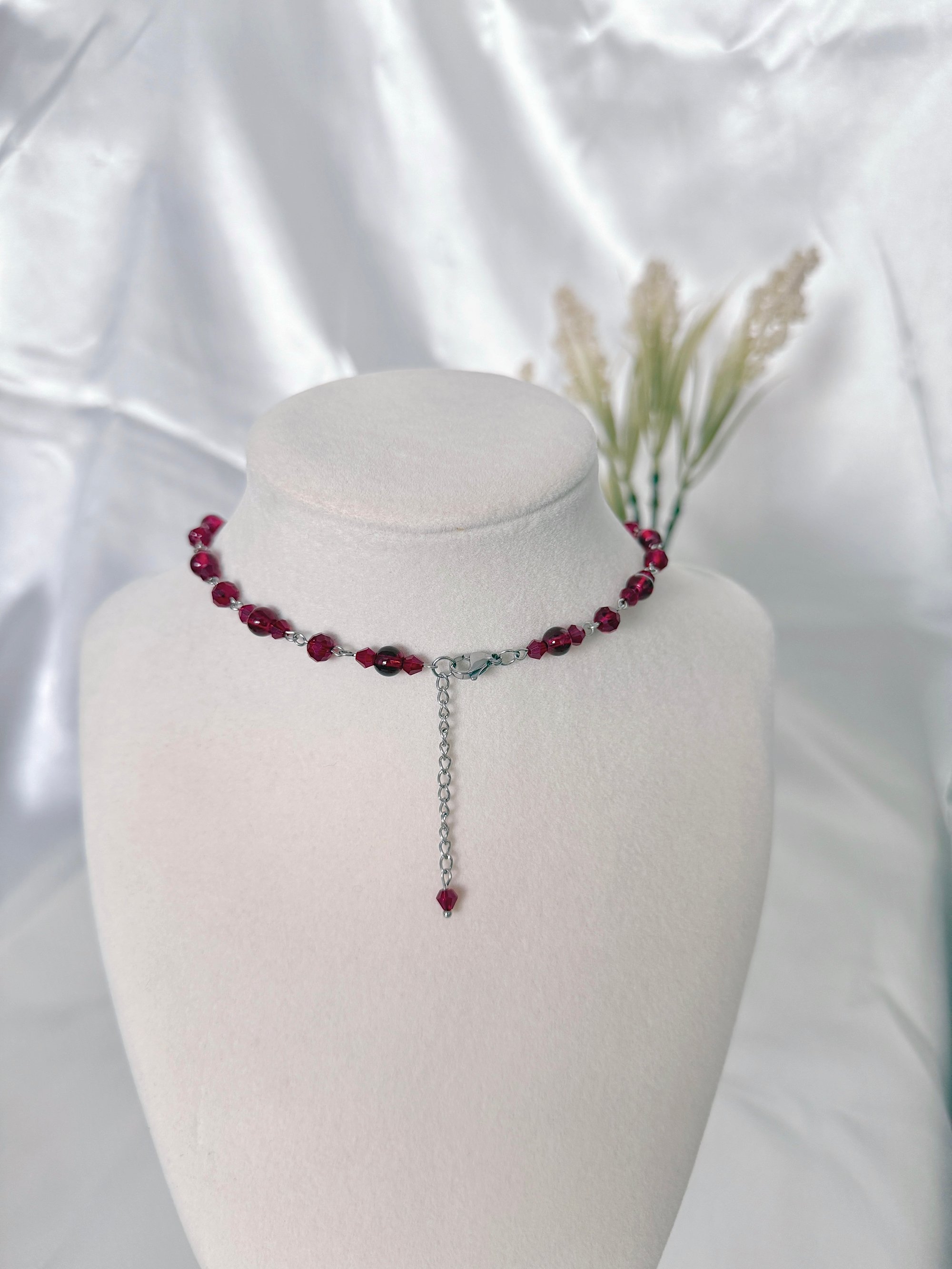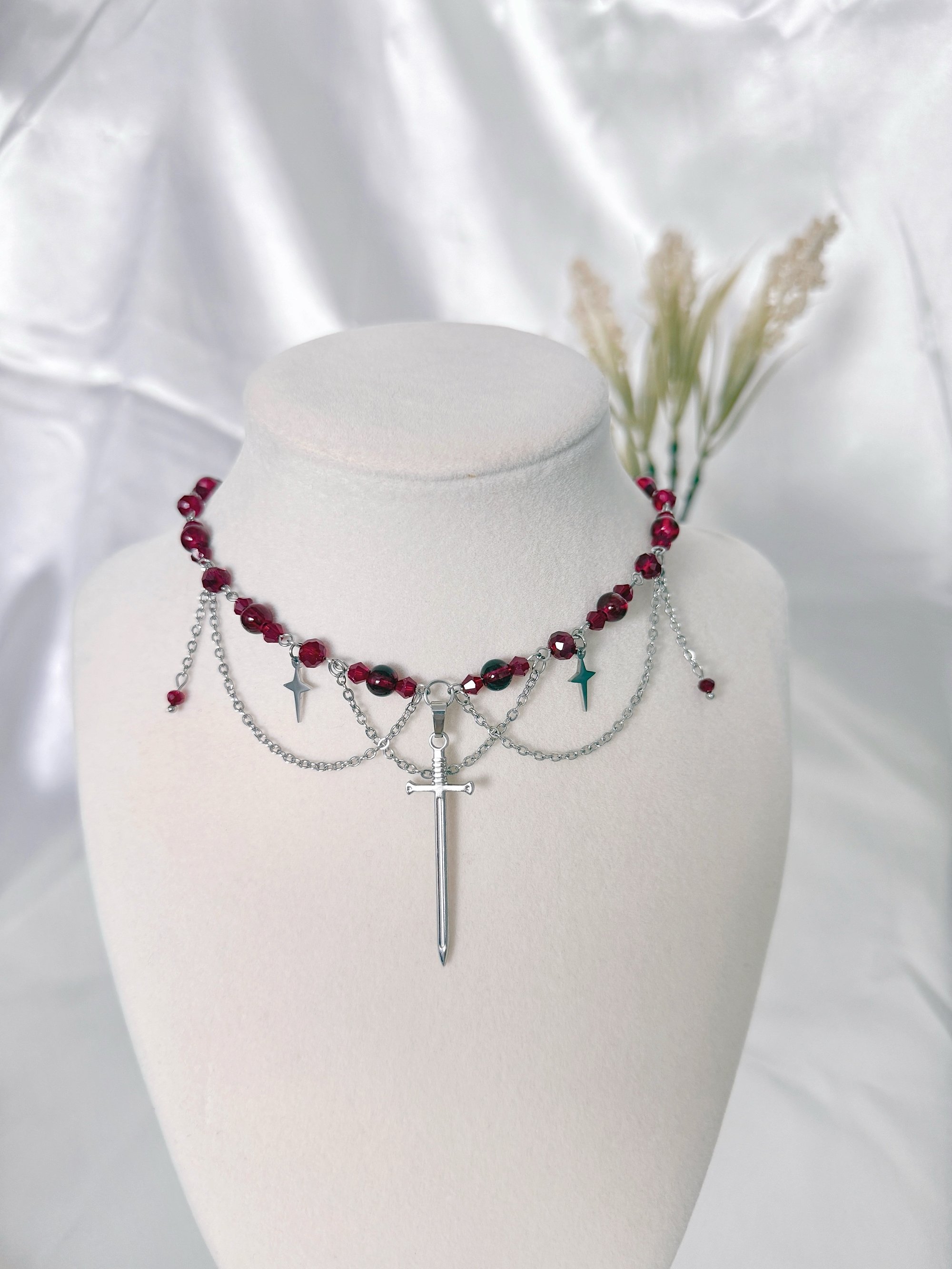A silver necklace featuring deep red glass beads, hanging chains and sword and star charms. Made with hypoallergenic, tarnish and rust-free stainless steel metal.