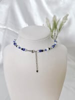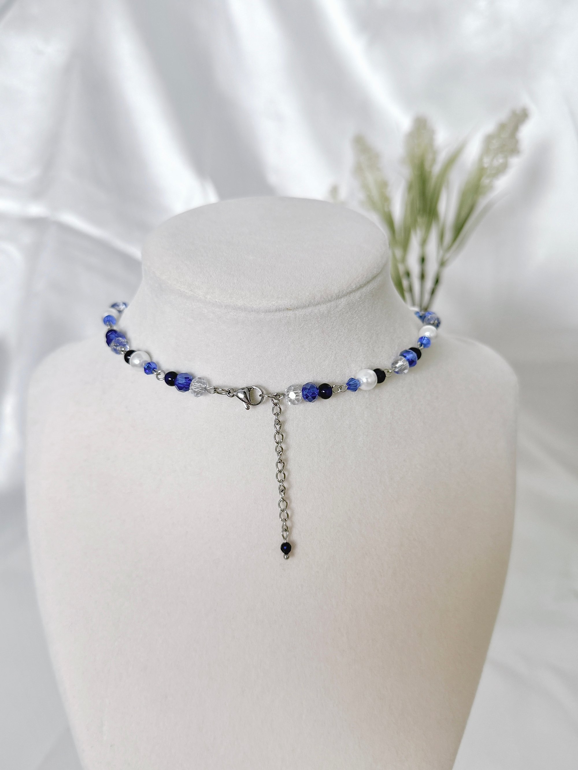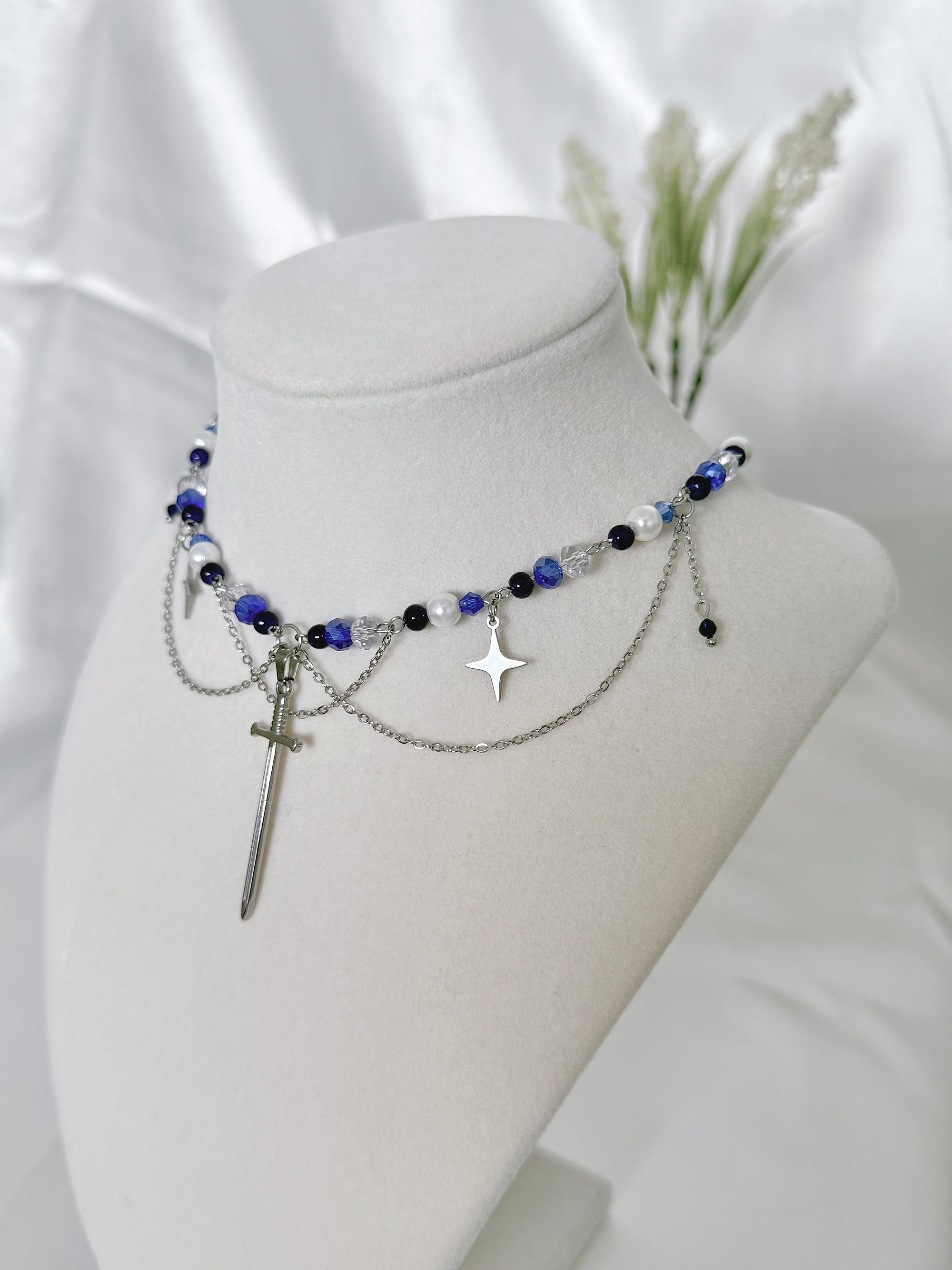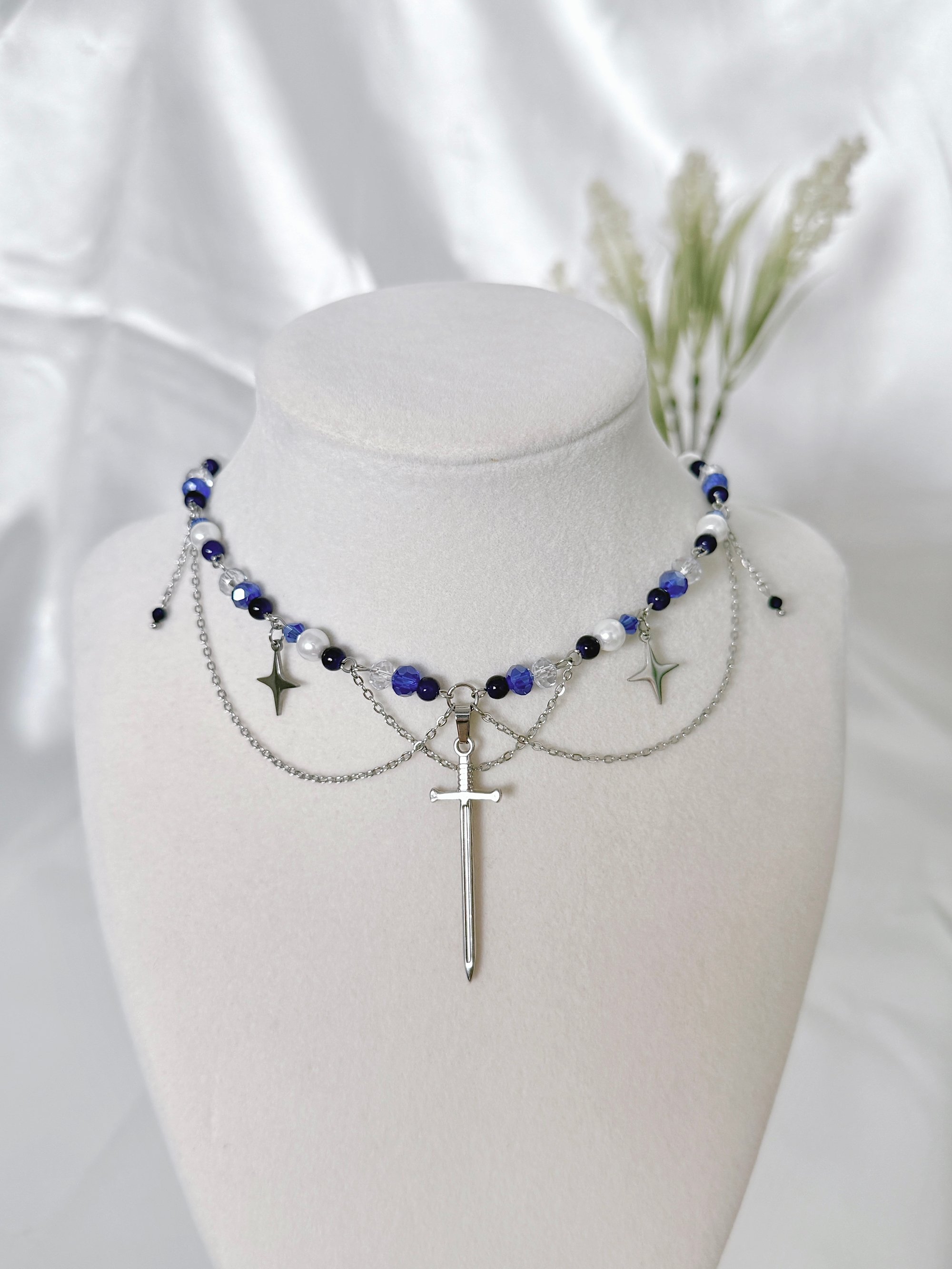 A silver necklace featuring deep blue, clear and pearl glass beads, hanging chains and sword and star charms. Made with hypoallergenic, tarnish and rust-free stainless steel metal.