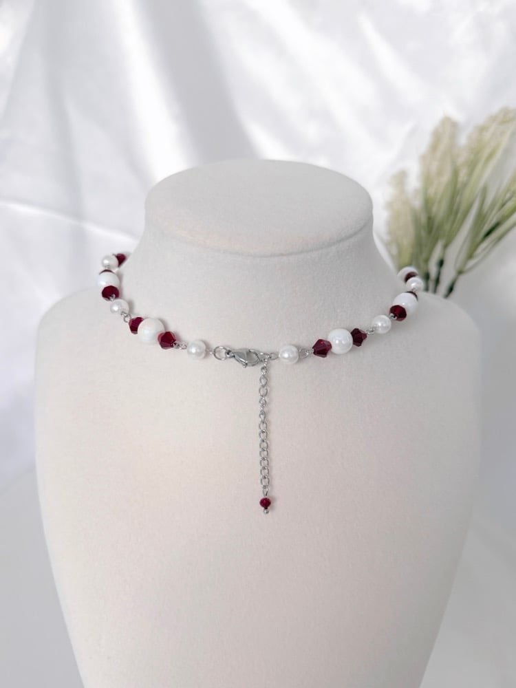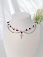 A silver necklace featuring deep red glass and pearl beads, hanging chains and a cross charm. Made with hypoallergenic, tarnish and rust-free stainless steel metal.
