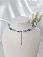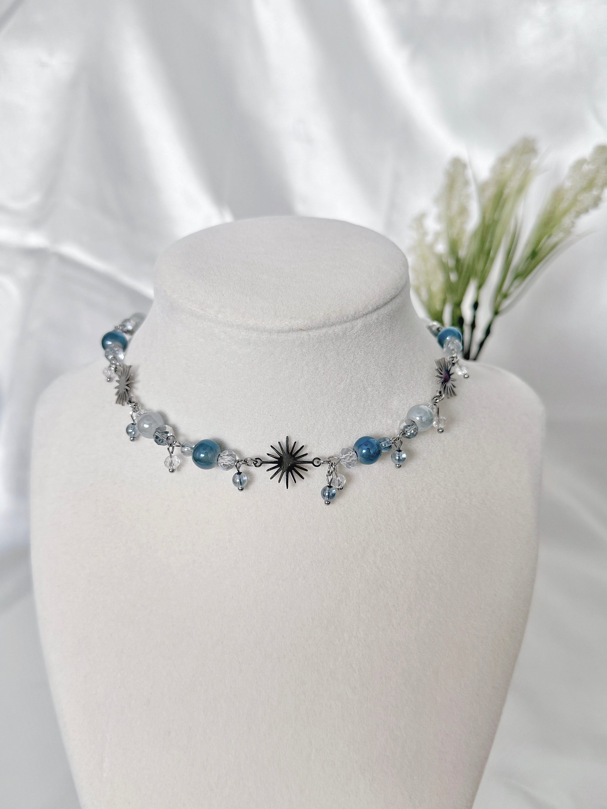 A silver necklace featuring sparkling blue, silver and clear glass beads and star accent charms. Made with hypoallergenic, tarnish and rust-free stainless steel metal.