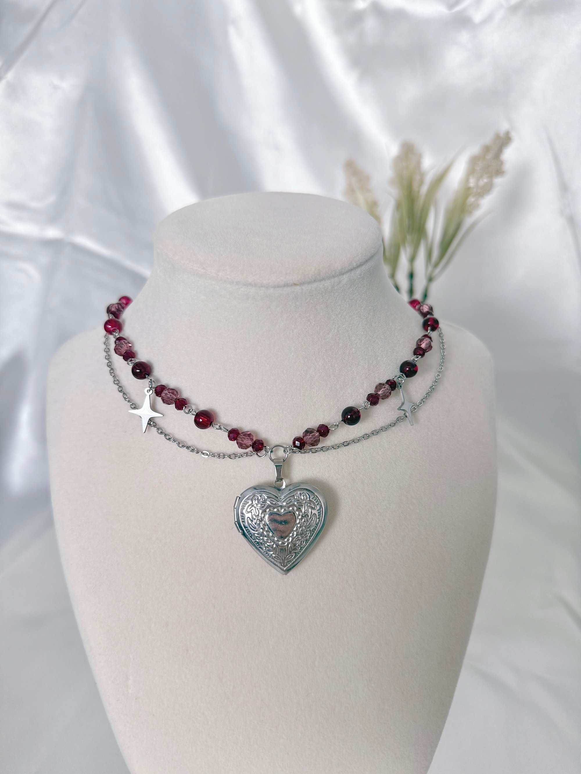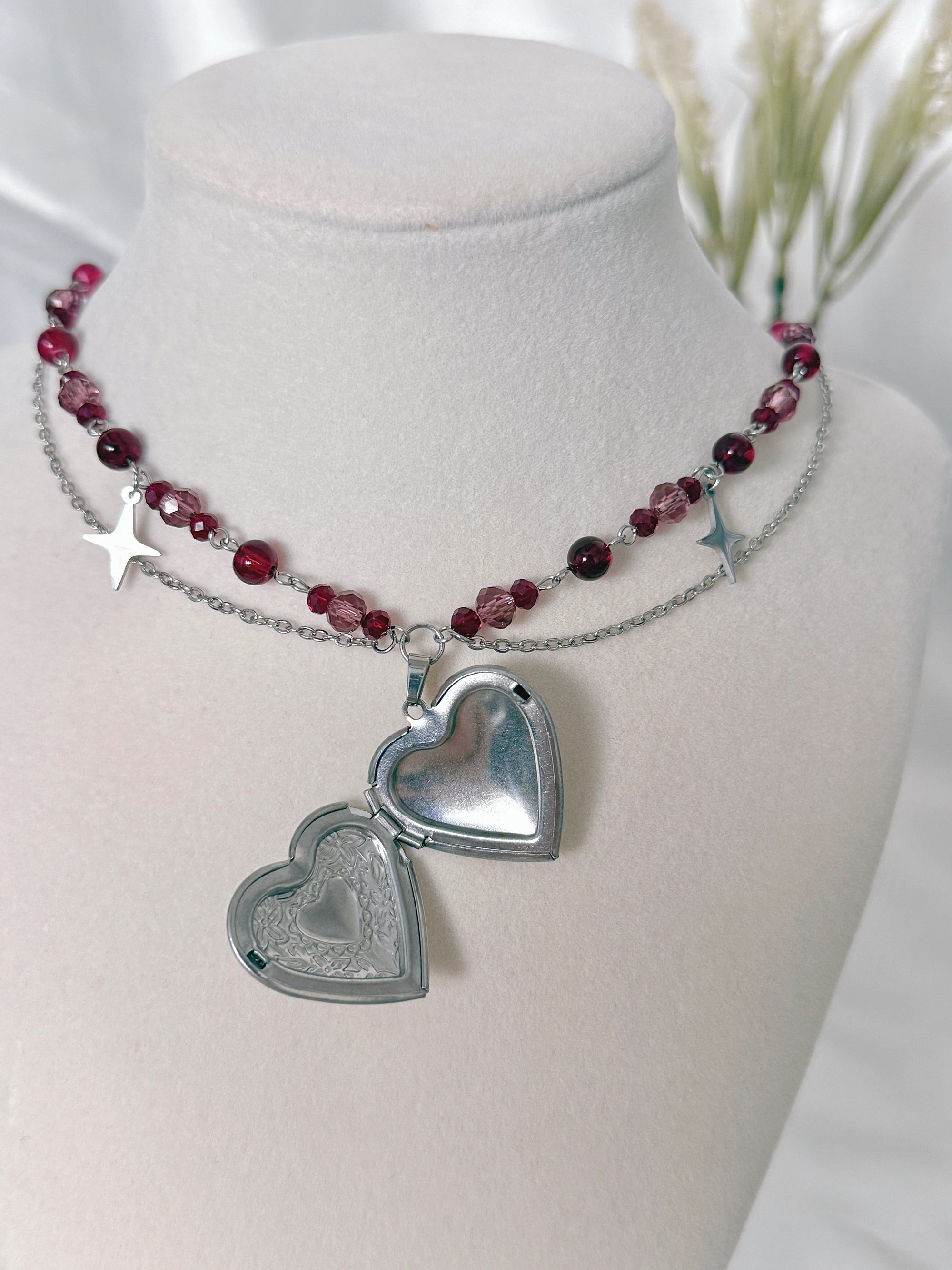 A silver necklace featuring mauve and red glass beads, hanging chains and a large heart locket and star charms. Made with hypoallergenic, tarnish and rust-free stainless steel metal.