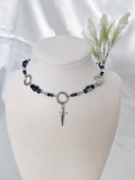 A silver necklace featuring navy, black and silver glass beads, intertwining ring accents and a dagger charm. Made with hypoallergenic, tarnish and rust-free stainless steel metal.